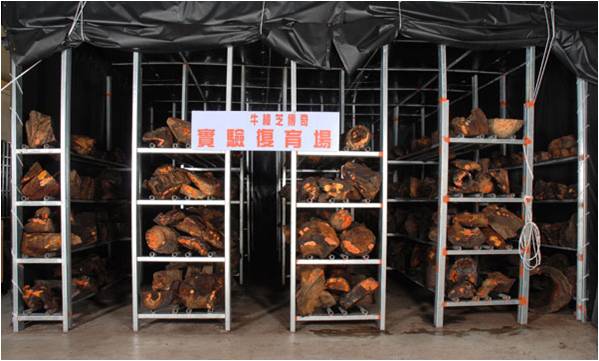 利用樟芝原有宿主牛樟树或其他椴木(树龄都在80年以上的椴木)为培养基栽培牛樟芝;能获得与野生牛樟芝相同之成分,功效相同,避免野生牛樟树被盗伐;培养时间大约2年。